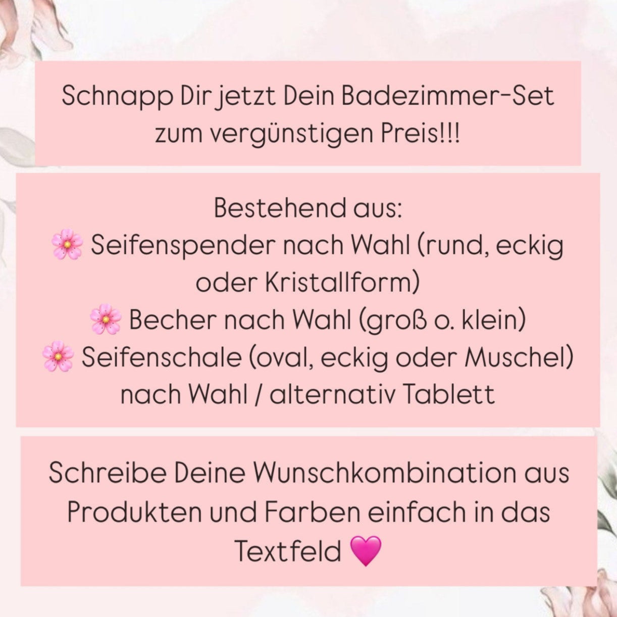 - Einem Seifenspender nach Wahl (rund, eckig oder Kristallform)